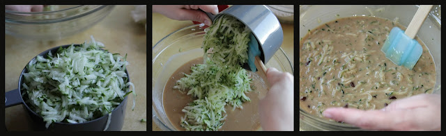 And then tightly squeezed in cheese cloth to get out the excess moisture. The Husband pointed out that this was the 3rd time I've done this step on this blog. The truth is when you are dealing with vegetables they innately have a lot of moisture in them. In some dishes, this moisture really works against the end result by either denying it the opportunity to brown (like in Latkahs) or requiring a much longer cooking time to cook off (like in the Relish). In this case the Zucchini is an ingredient that is supposed to add moisture to the end result. To much of this moisture, however, will increase baking time significantly. So for the sake of sanity, squeeze out as much as you can.